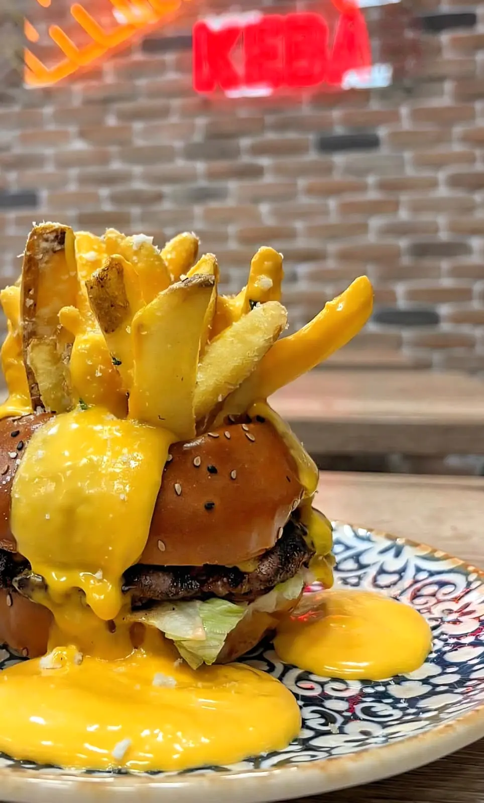 Burger vită Smash pe pat de cheddar, acompaniat de cartofi dippers cu usturoi, pătrunjel și parmezan.