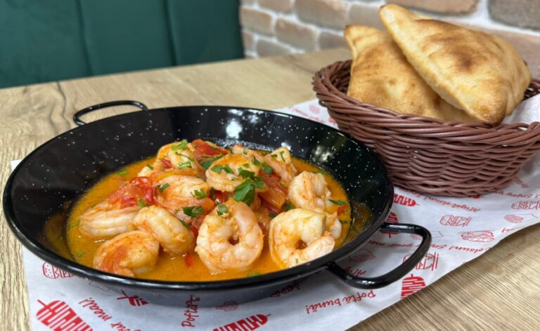 Deliciosii creveti in sos de vin si usturoi alaturi de unt si rosii cherry.